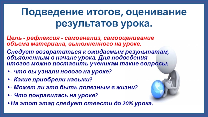 Следует возвратиться к ожидаемым результатам, объявленным в начале урока. Для подведения итогов можно поставить ученикам такие вопросы: