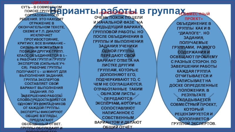 СОГЛАСОВАННОГО РЕШЕНИЯ. ЭТО НАХОДИТ ОТРАЖЕНИЕ В ОКОНЧАТЕЛЬНОМ ТЕКСТЕ, СХЕМЕ И Т.П. ДИАЛОГ ИСКЛЮЧАЕТ ПРОТИВОСТОЯНИЕ, КРИТИКУ, ВСЕ ВНИМАНИЕ – СИЛЬНЫМ МОМЕНТАМ В ПОЗИЦИИ ДРУГИХ ГРУПП. КЛАСС ОБЪЕДИНЯЕТСЯ В 5 – 6 РАБОЧИХ ГРУПП И ГРУППУ ЭКСПЕРТОВ (СИЛЬНЫЕ УЧ-СЯ). РАБОЧИЕ ГРУППЫ ПОЛУЧАЮТ 5 – 10 МИНУТ ДЛЯ ВЫПОЛНЕНИЯ ЗАДАНИЯ. ГРУППА ЭКСПЕРТОВ СОСТАВЛЯЕТ СВОЙ ВАРИАНТ ВЫПОЛНЕНИЯ ЗАДАНИЯ. ПО ЗАВЕРШЕНИЮ РАБОТЫ СЛОВО ПРЕДОСТАВЛЯЕТСЯ ОДНОМУ ИЗ ДОКЛАДЧИКОВ ОТ КАЖДОЙ ГРУППЫ. ЭКСПЕРТЫ ФИКСИРУЮТ ОБЩИЕ ВЗГЛЯДЫ, ПРЕДЛАГАЮТ ОБОБЩЕННЫЙ ОТВЕТ. ГРУППЫ ОБСУЖДАЮТ И ДОПОЛНЯЮТ ЕГО.