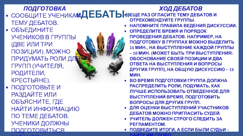 ОПРЕДЕЛИТЕ ВРЕМЯ И ПОРЯДОК ПРОВЕДЕНИЯ ДЕБАТОВ. НАПРИМЕР, НА ПОДГОТОВКУ В ГРУППАХ МОЖНО ВЫДЕЛИТЬ 15 МИН., НА ВЫСТУПЛЕНИЕ КАЖДОЙ ГРУППЫ – 10 МИН. (МОЖЕТ БЫТЬ ТРИ ВЫСТУПЛЕНИЯ: ОБОСНОВАНИЕ СВОЕЙ ПОЗИЦИИ И ДВА ОТВЕТА НА ВЫСТУПЛЕНИЯ И ВОПРОСЫ ДРУГИХ ГРУПП), НА ОБЩУЮ ДИСКУССИЮ – 15 МИН.