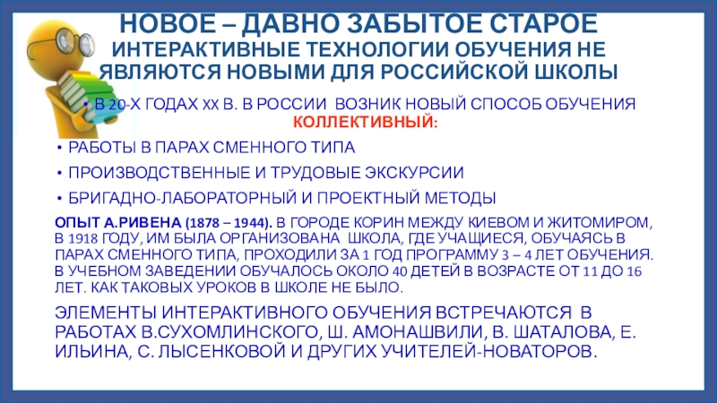 ЭЛЕМЕНТЫ ИНТЕРАКТИВНОГО ОБУЧЕНИЯ ВСТРЕЧАЮТСЯ В РАБОТАХ В.СУХОМЛИНСКОГО, Ш. АМОНАШВИЛИ, В. ШАТАЛОВА, Е. ИЛЬИНА, С. ЛЫСЕНКОВОЙ И ДРУГИХ УЧИТЕЛЕЙ-НОВАТОРОВ.