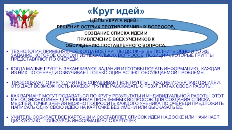 КАК ВАРИАНТ МОГУТ ПОДАВАТЬСЯ ПО КРУГУ РЕЗУЛЬТАТЫ И ИНДИВИДУАЛЬНОЙ РАБОТЫ. ЭТОТ МЕТОД ЭФФЕКТИВЕН ДЛЯ РЕШЕНИЯ ПРОБЛЕМНЫХ ВОПРОСОВ. ДЛЯ СОЗДАНИЯ СПИСКА МЫСЛЕЙ, ТОЧЕК ЗРЕНИЯ МОЖНО ПОПРОСИТЬ КАЖДОГО УЧЕНИКА ПО ОЧЕРЕДИ ПРЕДЛОЖИТЬ НАПИСАТЬ ОДНУ СВОЮ ИДЕЮ НА КАРТОЧКЕ БЕЗ ИМЕНИ ИЛИ ВЫСКАЗАТЬ ЕЕ.