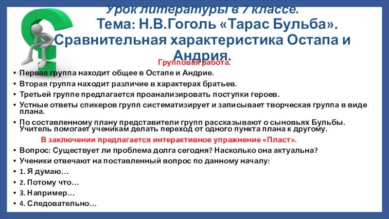 По составленному плану представители групп рассказывают о сыновьях Бульбы. Учитель помогает ученикам делать переход от одного пункта плана к другому.