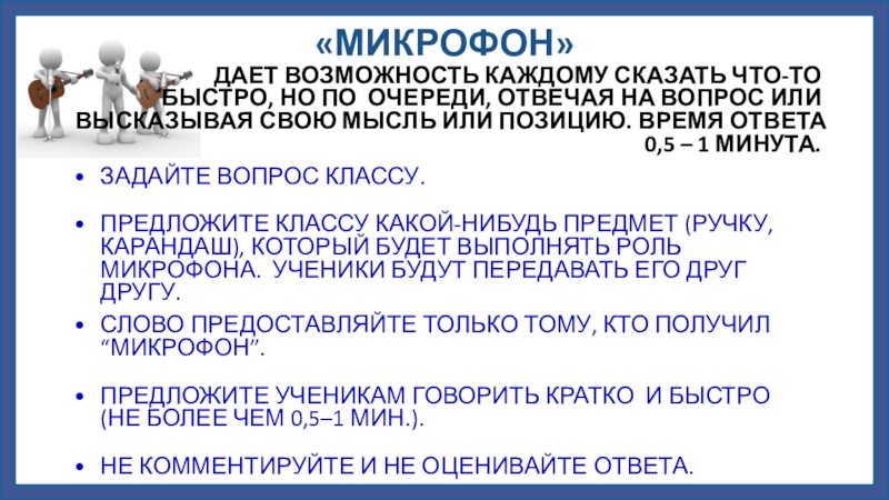 ПРЕДЛОЖИТЕ КЛАССУ КАКОЙ-НИБУДЬ ПРЕДМЕТ (РУЧКУ, КАРАНДАШ), КОТОРЫЙ БУДЕТ ВЫПОЛНЯТЬ РОЛЬ МИКРОФОНА. УЧЕНИКИ БУДУТ ПЕРЕДАВАТЬ ЕГО ДРУГ ДРУГУ.