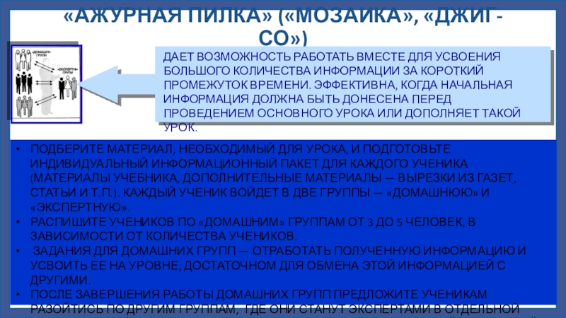 ОБЪЕДИНЕНИЕ В ГРУППЫ КАК И В “ДИАЛОГЕ”. НО ЗАДАНИЯ, ПОЛУЧАЕМЫЕ ГРУППАМИ, РАЗНОГО СОДЕРЖАНИЯ И ОСВЕЩАЮТ ПРОБЛЕМУ С РАЗНЫХ СТОРОН. ПО ЗАВЕРШЕНИИ РАБОТЫ КАЖДАЯ ГРУППА ОТЧИТЫВАЕТСЯ И ЗАПИСЫВАЕТ НА ДОСКЕ ОПРЕДЕЛЕННЫЕ ПОЛОЖЕНИЯ. В РЕЗУЛЬТАТЕ СКЛАДЫВАЕТСЯ СОВМЕСТНЫЙ ПРОЕКТ, КОТОРЫЙ РЕЦЕНЗИРУЕТСЯ И ДОПОЛНЯЕТСЯ ГРУППОЙ ЭКСПЕРТОВ.