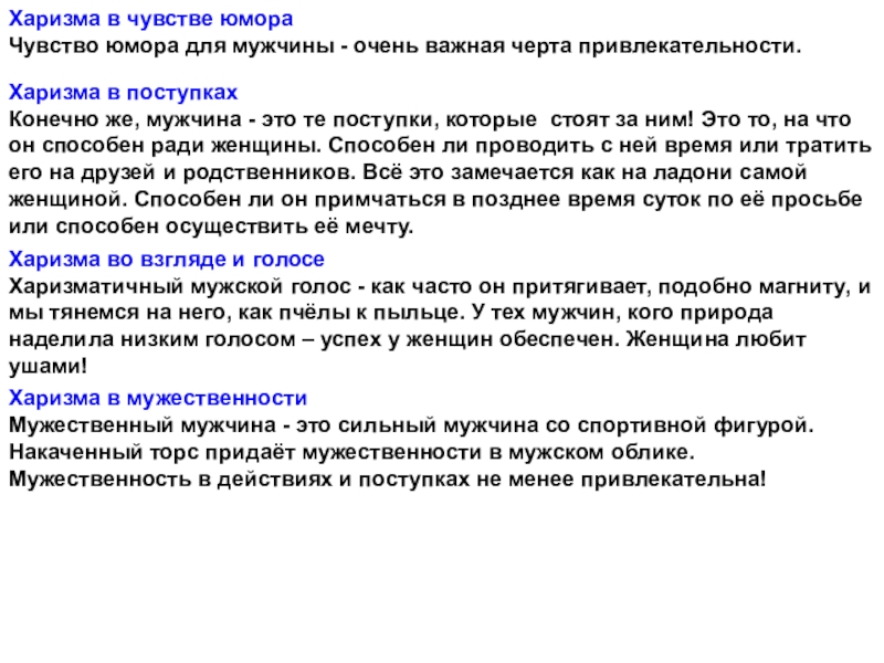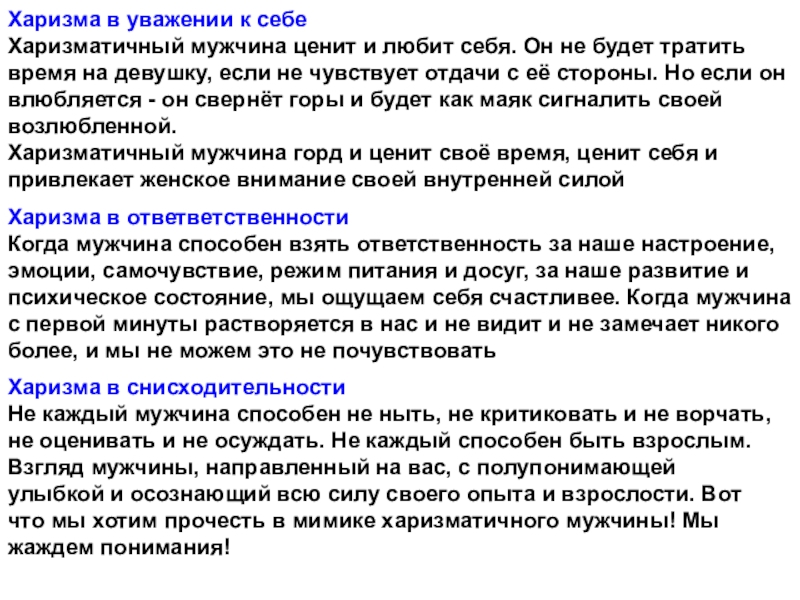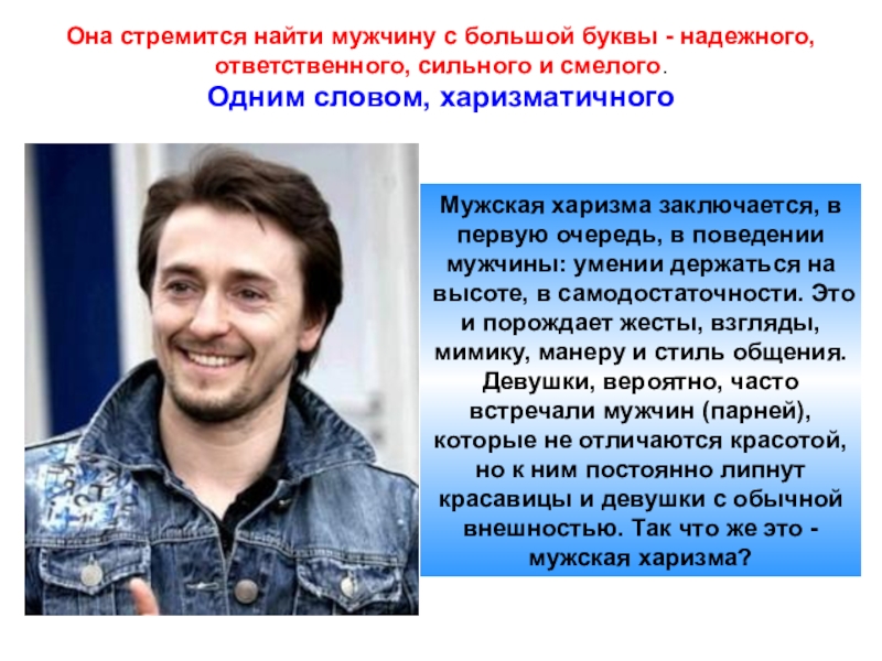 Мужская харизма заключается, в первую очередь, в поведении мужчины: умении держаться на высоте, в самодостаточности. Это и порождает жесты, взгляды, мимику, манеру и стиль общения. Девушки, вероятно, часто встречали мужчин (парней), которые не отличаются красотой, но к ним постоянно липнут красавицы и девушки с обычной внешностью. Так что же это - мужская харизма?