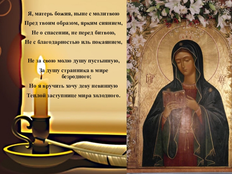 Я, матерь божия, ныне с молитвоюПред твоим образом, ярким сиянием,Не о спасении, не перед битвою,Не с благодарностью иль покаянием,Не за свою молю