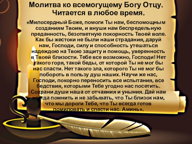 Слайд 4Молитва ко всемогущему Богу Отцу. Читается в любое время.