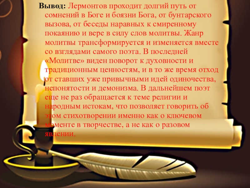 Слайд 11Вывод: Лермонтов проходит долгий путь от сомнений в Боге и боязни