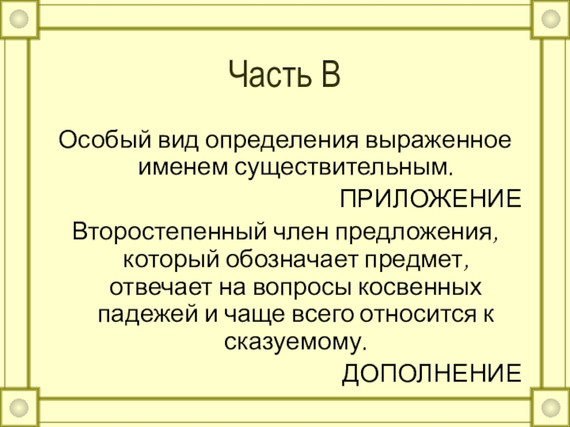 который обозначает предмет, отвечает на вопросы косвенных падежей и чаще всего относится к сказуемому.
