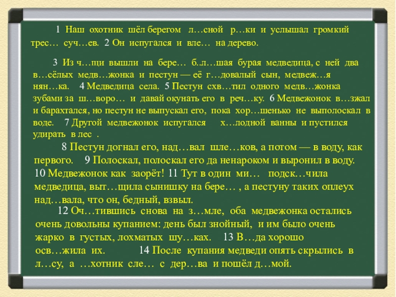 8 Пестун догнал его, над…вал шле…ков, а потом — в воду, как первого. 9 Полоскал, полоскал его да ненароком и выронил в воду. 10 Медвежонок как заорёт! 11 Тут в один ми… подск…чила медведица, выт…щила сынишку на бере… , а пестуну таких оплеух над…вала, что он, бедный, взвыл.
