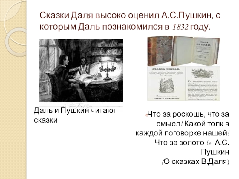 Слайд 17Сказки Даля высоко оценил А.С.Пушкин, с которым Даль познакомился в 1832