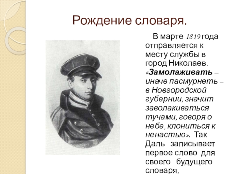 марте 1819 года отправляется к месту службы в город Николаев. «Замолаживать – иначе пасмурнеть – в Новгородской губернии, значит заволакиваться тучами, говоря о небе, клониться к ненастью». Так Даль записывает первое слово для своего будущего словаря, услышанное от ямщика.