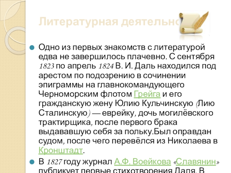 С сентября 1823 по апрель 1824 В. И. Даль находился под арестом по подозрению в сочинении эпиграммы на главнокомандующего Черноморским флотом Грейга и его гражданскую жену Юлию Кульчинскую (Лию Сталинскую) — еврейку, дочь могилёвского трактирщика, после первого брака выдававшую себя за польку.Был оправдан судом, после чего перевёлся из Николаева в Кронштадт.