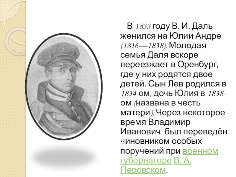 на Юлии Андре (1816—1838). Молодая семья Даля вскоре переезжает в Оренбург, где у них родятся двое детей. Сын Лев родился в 1834-ом, дочь Юлия в 1838-ом (названа в честь матери). Через некоторое время Владимир Иванович был переведён чиновником особых поручений при военном губернаторе В. А. Перовском.