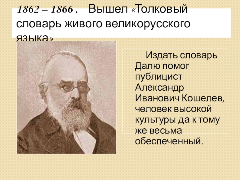 Слайд 211862 – 1866 . Вышел «Толковый словарь живого великорусского языка»
