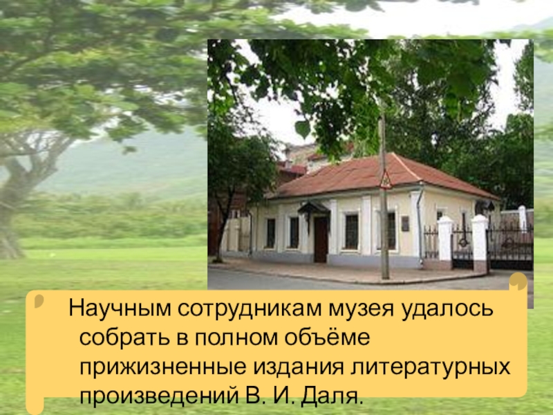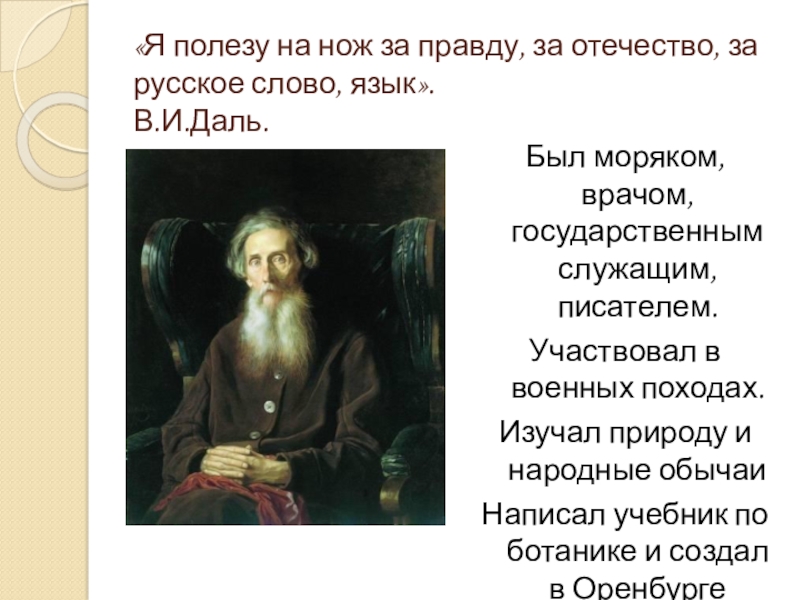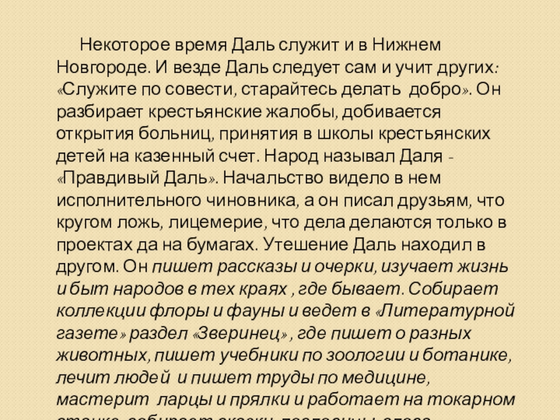 Нижнем Новгороде. И везде Даль следует сам и учит других: «Служите по совести, старайтесь делать добро». Он разбирает крестьянские жалобы, добивается открытия больниц, принятия в школы крестьянских детей на казенный счет. Народ называл Даля - «Правдивый Даль». Начальство видело в нем исполнительного чиновника, а он писал друзьям, что кругом ложь, лицемерие, что дела делаются только в проектах да на бумагах. Утешение Даль находил в другом. Он пишет рассказы и очерки, изучает жизнь и быт народов в тех краях , где бывает. Собирает коллекции флоры и фауны и ведет в «Литературной газете» раздел «Зверинец» , где пишет о разных животных, пишет учебники по зоологии и ботанике, лечит людей и пишет труды по медицине, мастерит ларцы и прялки и работает на токарном станке, собирает сказки, пословицы, слова.