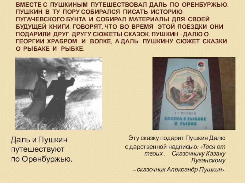 собирался писать историю Пугачевского бунта и собирал материалы для своей будущей книги. Говорят, что во время этой поездки они подарили друг другу сюжеты сказок. Пушкин - Далю о Георгии Храбром и волке, а Даль Пушкину сюжет сказки о рыбаке и рыбке.