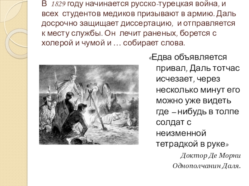 в армию. Даль досрочно защищает диссертацию, и отправляется к месту службы. Он лечит раненых, борется с холерой и чумой и … собирает слова.