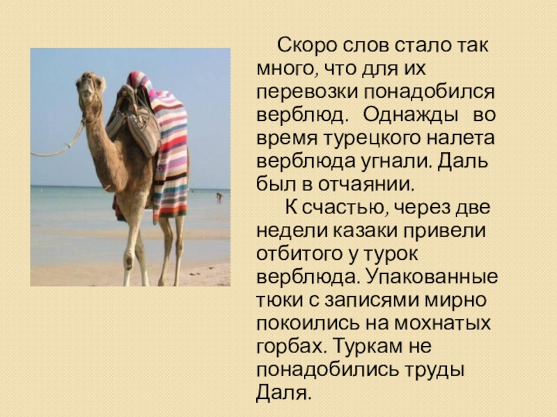 перевозки понадобился верблюд. Однажды во время турецкого налета верблюда угнали. Даль был в отчаянии.