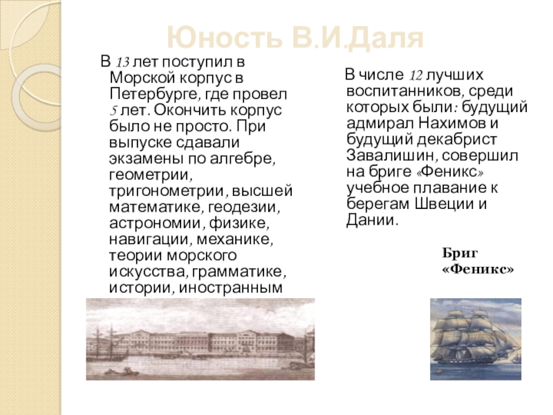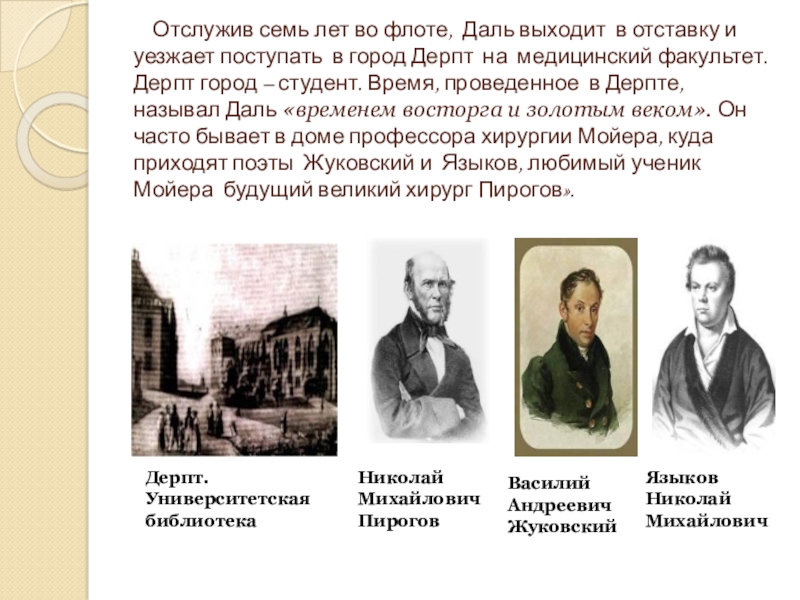 и уезжает поступать в город Дерпт на медицинский факультет. Дерпт город – студент. Время, проведенное в Дерпте, называл Даль «временем восторга и золотым веком». Он часто бывает в доме профессора хирургии Мойера, куда приходят поэты Жуковский и Языков, любимый ученик Мойера будущий великий хирург Пирогов».