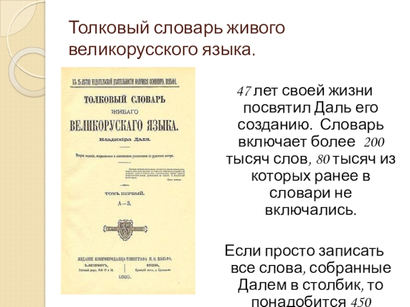 Если просто записать все слова, собранные Далем в столбик, то понадобится 450 школьных тетрадей.