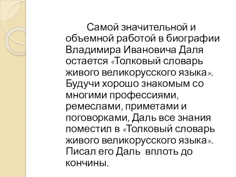 в биографии Владимира Ивановича Даля остается «Толковый словарь живого великорусского языка». Будучи хорошо знакомым со многими профессиями, ремеслами, приметами и поговорками, Даль все знания поместил в «Толковый словарь живого великорусского языка». Писал его Даль вплоть до кончины.