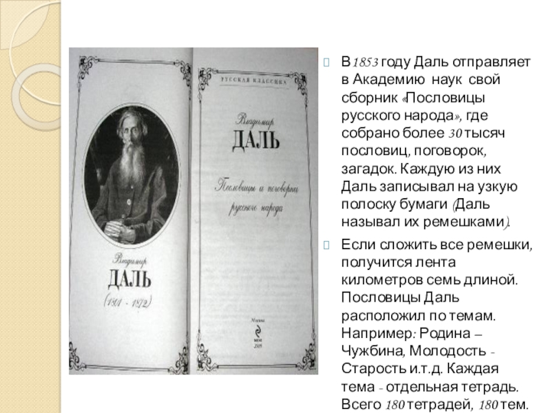 народа», где собрано более 30 тысяч пословиц, поговорок, загадок. Каждую из них Даль записывал на узкую полоску бумаги (Даль называл их ремешками).