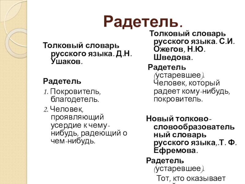 Радетель (устаревшее). Человек, который радеет кому-нибудь, покровитель.