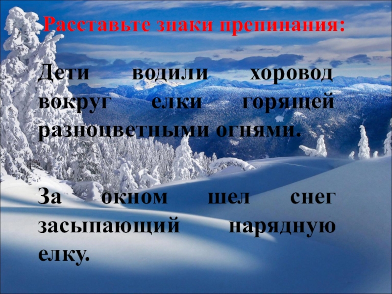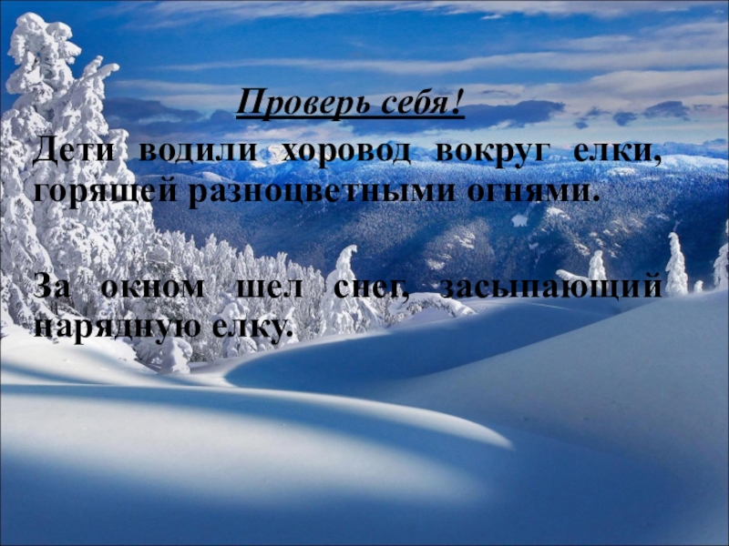 Проверь себя!Дети водили хоровод вокруг елки, горящей разноцветными огнями.За окном шел снег, засыпающий нарядную елку.