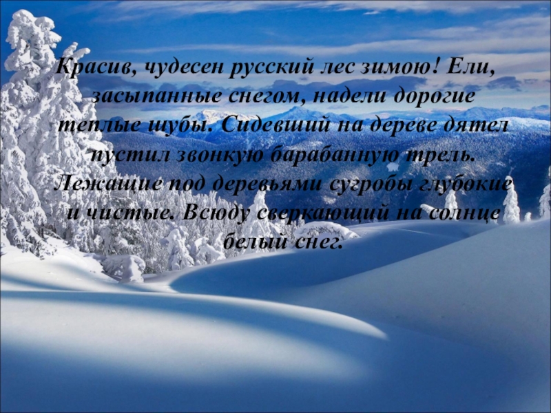 Слайд 5Красив, чудесен русский лес зимою! Ели, засыпанные снегом, надели дорогие теплые