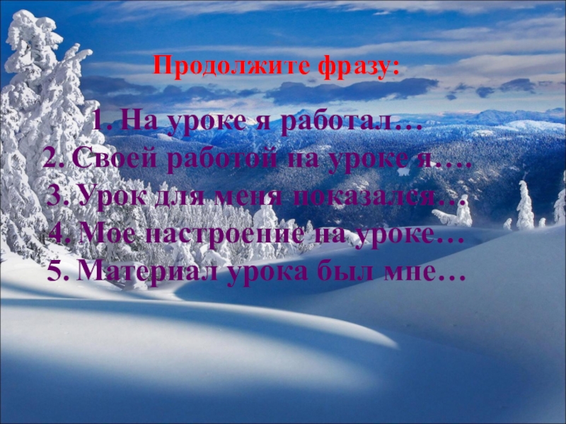 Продолжите фразу:На уроке я работал…Своей работой на уроке я….Урок для меня показался…Мое настроение на уроке…Материал урока был