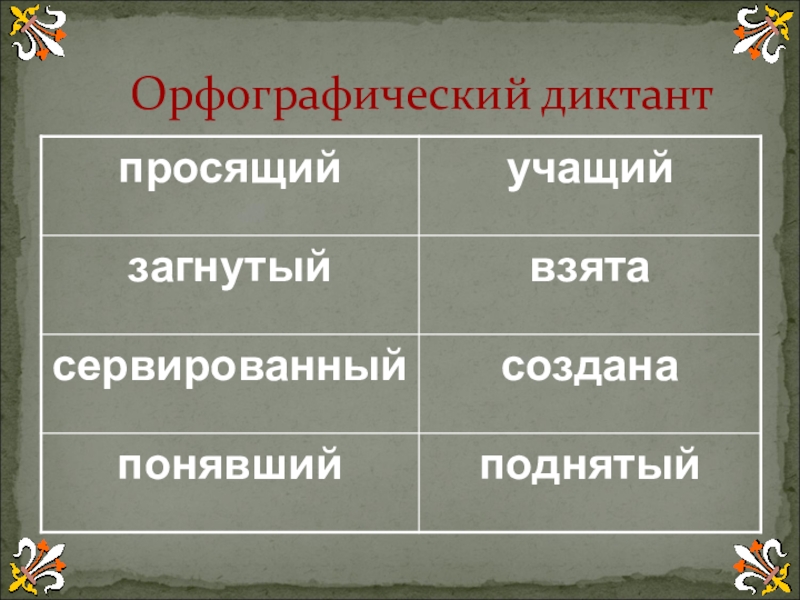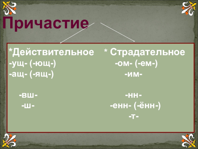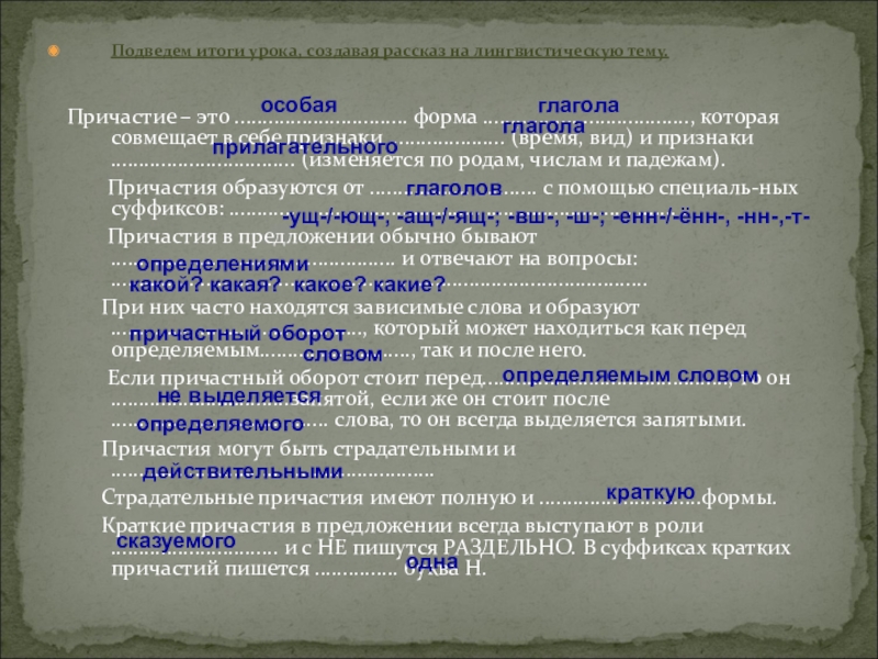 -ущ-/-ющ-, -ащ-/-ящ-; -вш-, -ш-; -енн-/-ённ-, -нн-,-т-