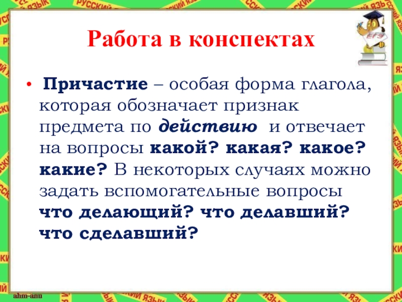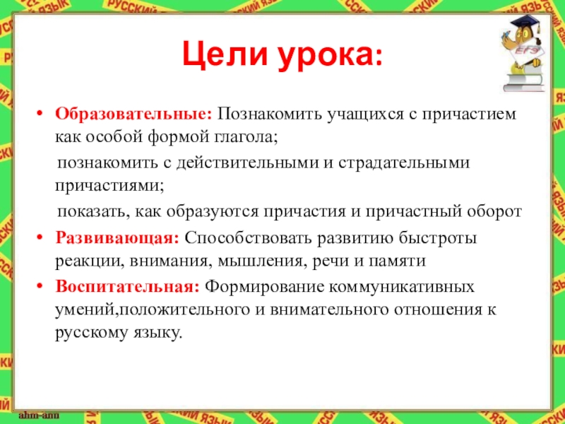 Образовательные: Познакомить учащихся с причастием как особой формой глагола;