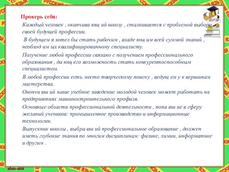 В будущем я хотел бы стать рабочим , владе ющ им всей суммой знаний , необход им ых квалифицированному специалисту.