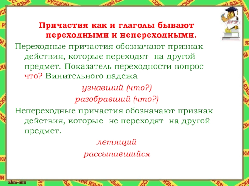 Слайд 14Причастия как и глаголы бывают переходными и непереходными.