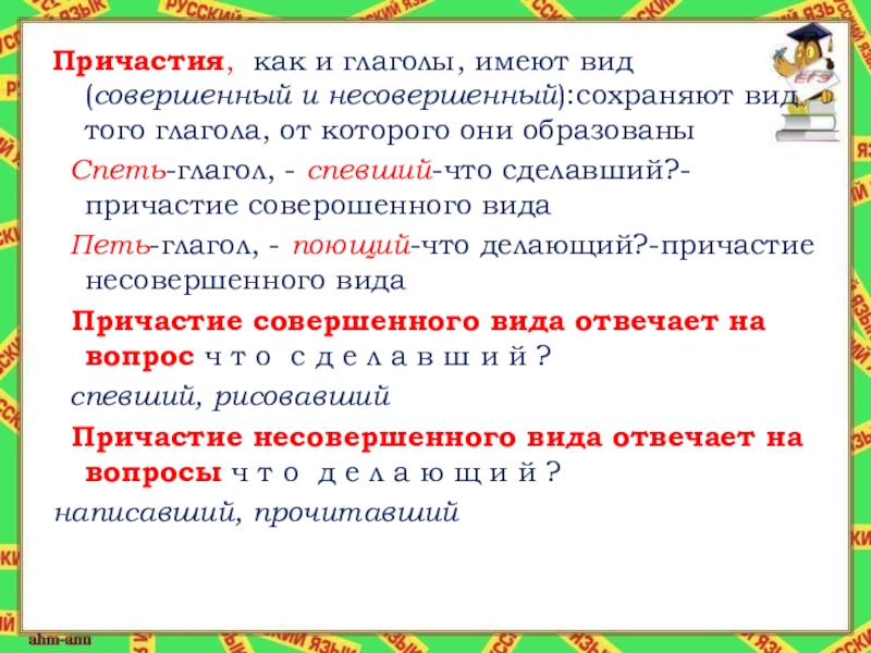 Слайд 9Причастия, как и глаголы, имеют вид (совершенный и несовершенный):сохраняют вид того