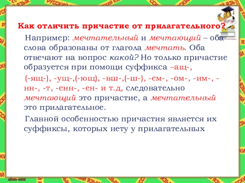 Главной особенностью причастия является их суффиксы, которых нету у прилагательных