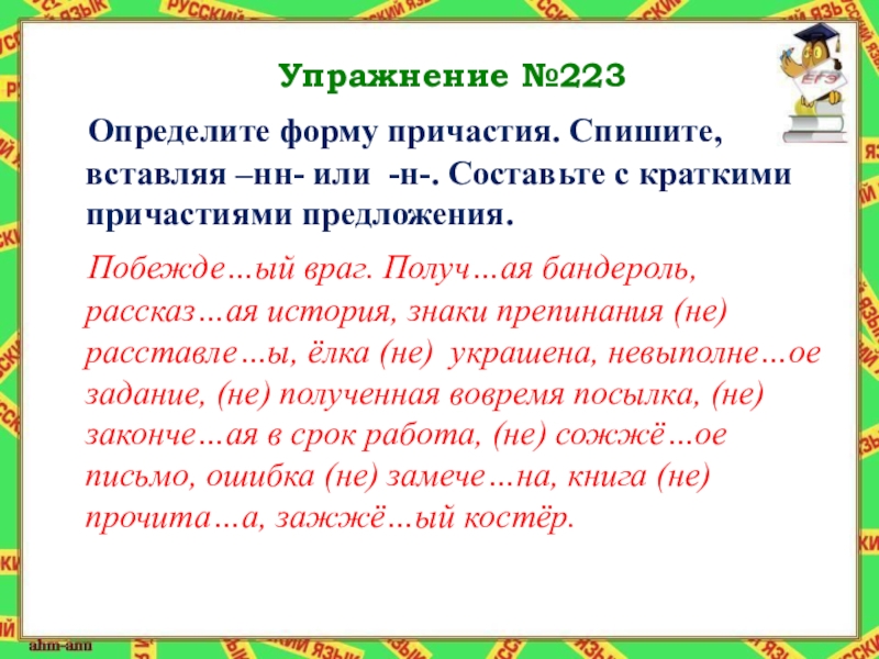 Побежде…ый враг. Получ…ая бандероль, рассказ…ая история, знаки препинания (не)расставле…ы, ёлка (не) украшена, невыполне…ое задание, (не) полученная вовремя посылка, (не) законче…ая в срок работа, (не) сожжё…ое письмо, ошибка (не) замече…на, книга (не) прочита…а, зажжё…ый костёр.