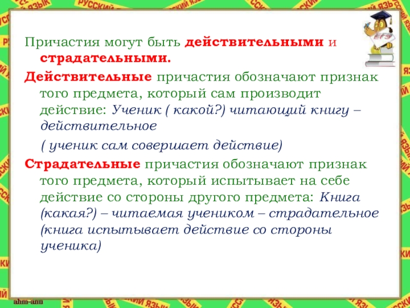 Страдательные причастия обозначают признак того предмета, который испытывает на себе действие со стороны другого предмета: Книга (какая?) – читаемая учеником – страдательное (книга испытывает действие со стороны ученика)