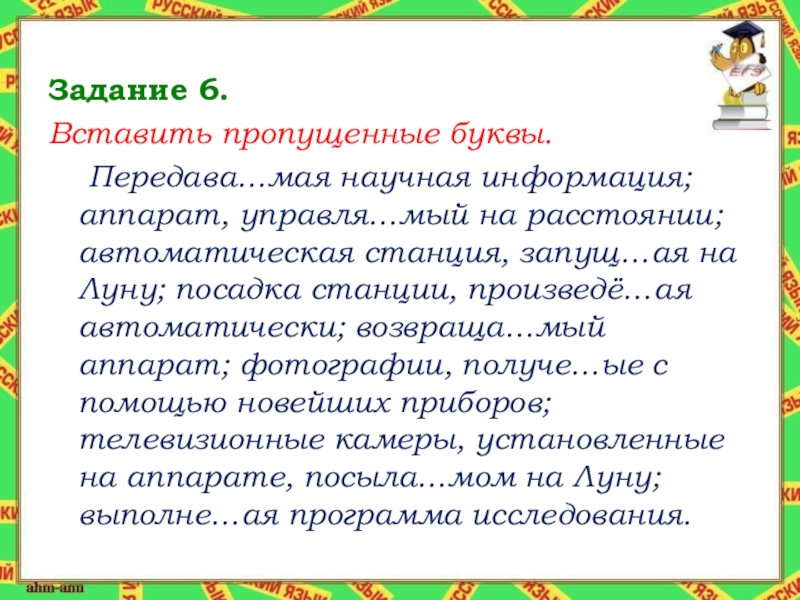 на расстоянии; автоматическая станция, запущ…ая на Луну; посадка станции, произведё…ая автоматически; возвраща…мый аппарат; фотографии, получе…ые с помощью новейших приборов; телевизионные камеры, установленные на аппарате, посыла…мом на Луну; выполне…ая программа исследования.