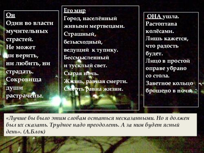 «Лучше бы было этим словам остаться несказанными. Но я должен был их сказать. Трудное надо преодолеть. А за ним будет ясный день». (А.Блок)