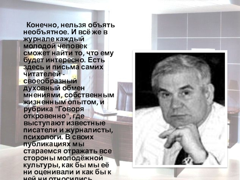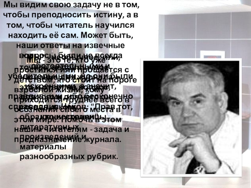 Мы - это те, кто уже простился или прощается с детством, кто стоит на пороге взрослой жизни, кому приходится труднее всего в осознании своего места в этом мире. Помочь в этом нашим читателям - задача и предназначение журнала.