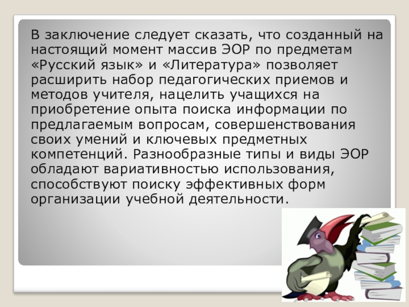 В заключение следует сказать, что созданный на настоящий момент массив ЭОР