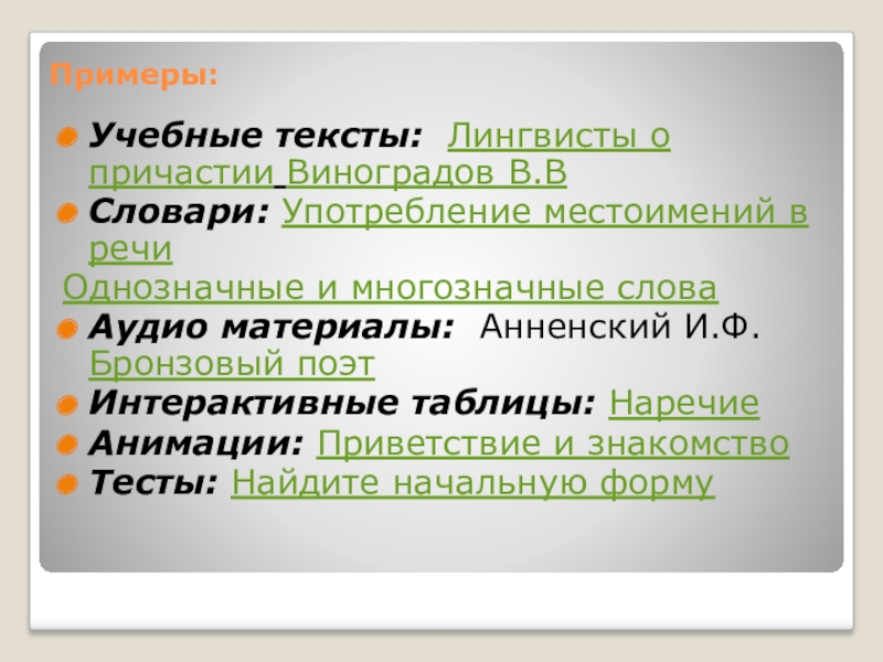 и аудио учебные тексты, словари, статичные и интерактивные таблицы и схемы, электронные задания и тесты.
