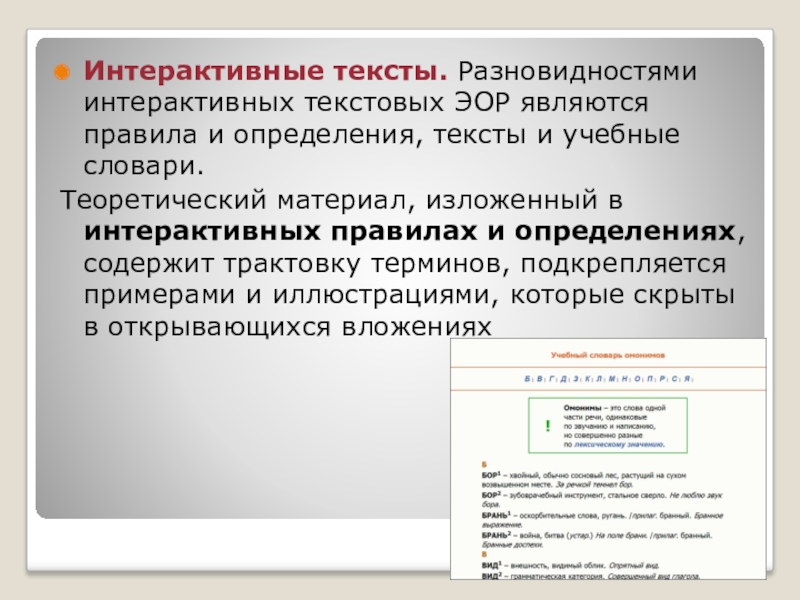 Интерактивные тексты. Разновидностями интерактивных текстовых ЭОР являются правила и определения, тексты