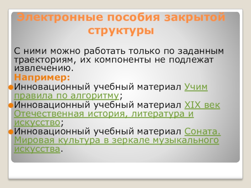 Интерактивные (благодаря технологиям мультимедиа и гипертекста обладают динамичным содержанием, возможностью, на основе гипертекста, интеграции различных форм представления информации (текст, иллюстрации, звук), наличием оперативной обратной связи обучаемого с их содержательными компонентами, позволяют нелинейно, выборочно, порционно подавать учебный материал).