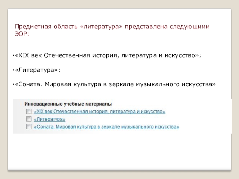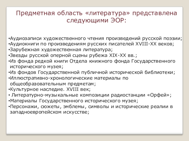 Слайд 13Предметная область «литература» представлена следующими ЭОР: