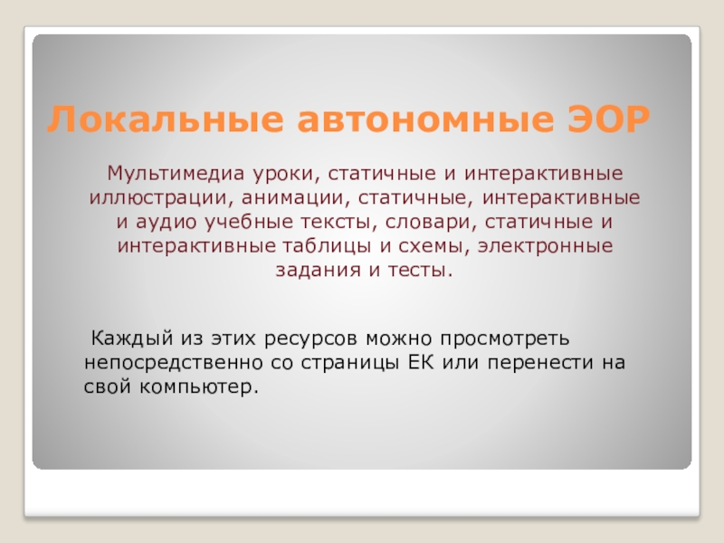 являются локальные автономные ЭОР, перечисленные выше. Каждый из компонентов можно просмотреть и перенести на свой компьютер, но для полноценной работы, как правило, необходимо установить на локальный компьютер все ресурсы подобного пособия.