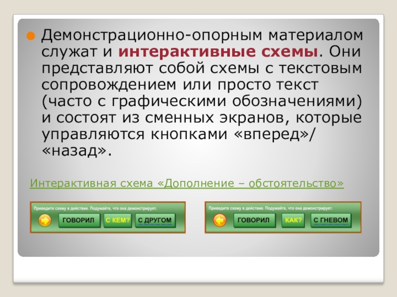 Демонстрационно-опорным материалом служат и интерактивные схемы. Они представляют собой схемы с