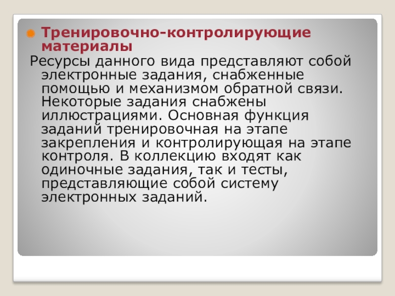 механизмом обратной связи. Некоторые задания снабжены иллюстрациями. Основная функция заданий тренировочная на этапе закрепления и контролирующая на этапе контроля. В коллекцию входят как одиночные задания, так и тесты, представляющие собой систему электронных заданий.